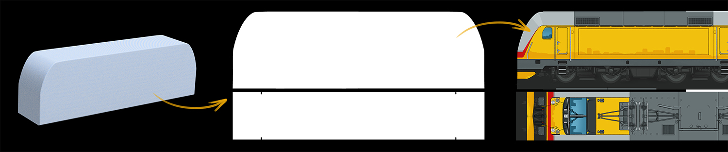 Na mnou navrhnutý zjednodušený tvar, který se vyřeže z molitanu, jsem nakreslil do střihů od klienta specifické vozidlo ve specifické verzi a barevné kombinaci. Spousta různých modelů a verzí můžete vidět na stránkách klienta fotodeky.cz .