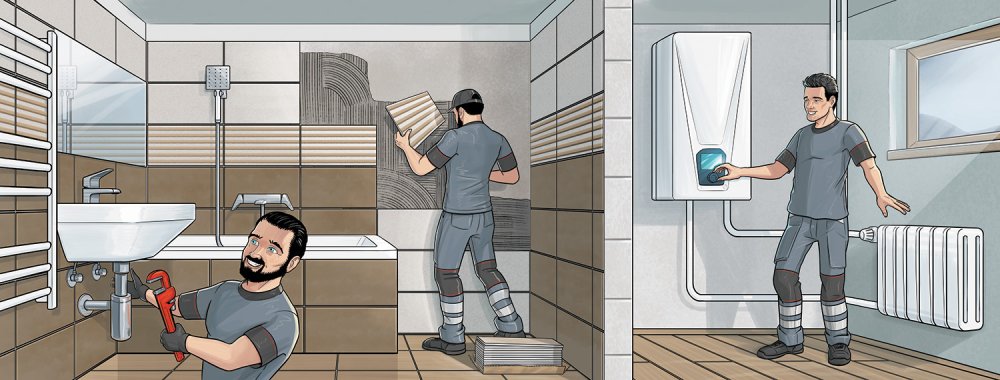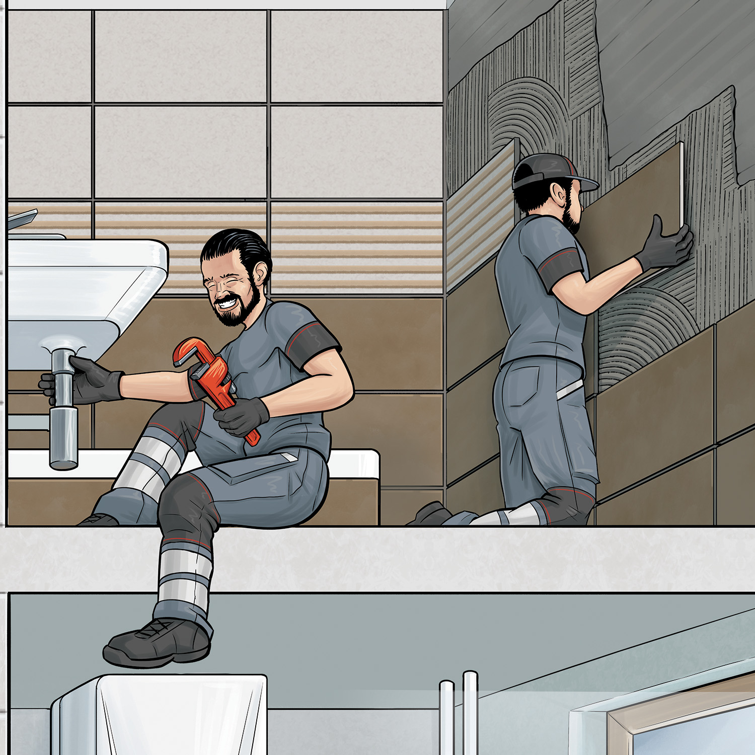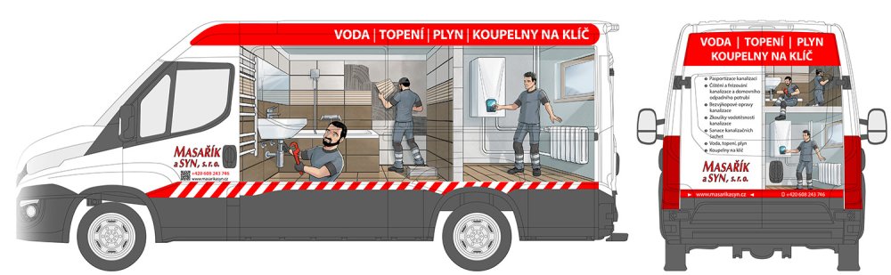 Velkoformátová ilustrace pro polep dodávky, prezentující instalatérské služby.