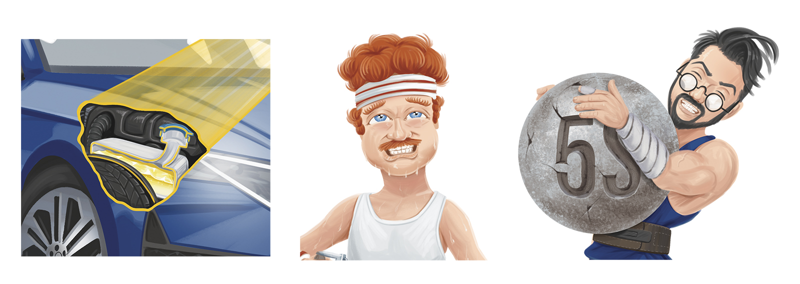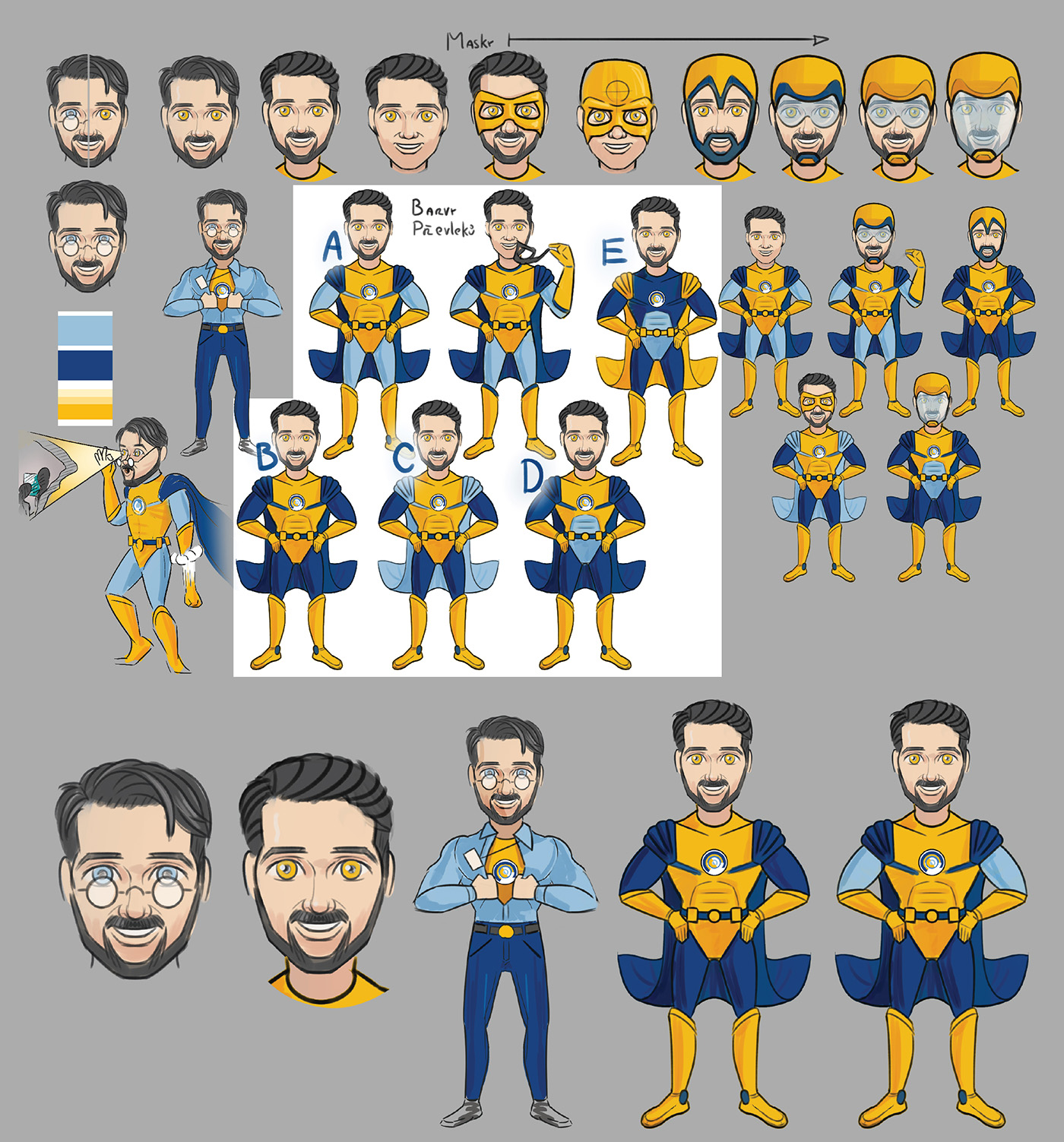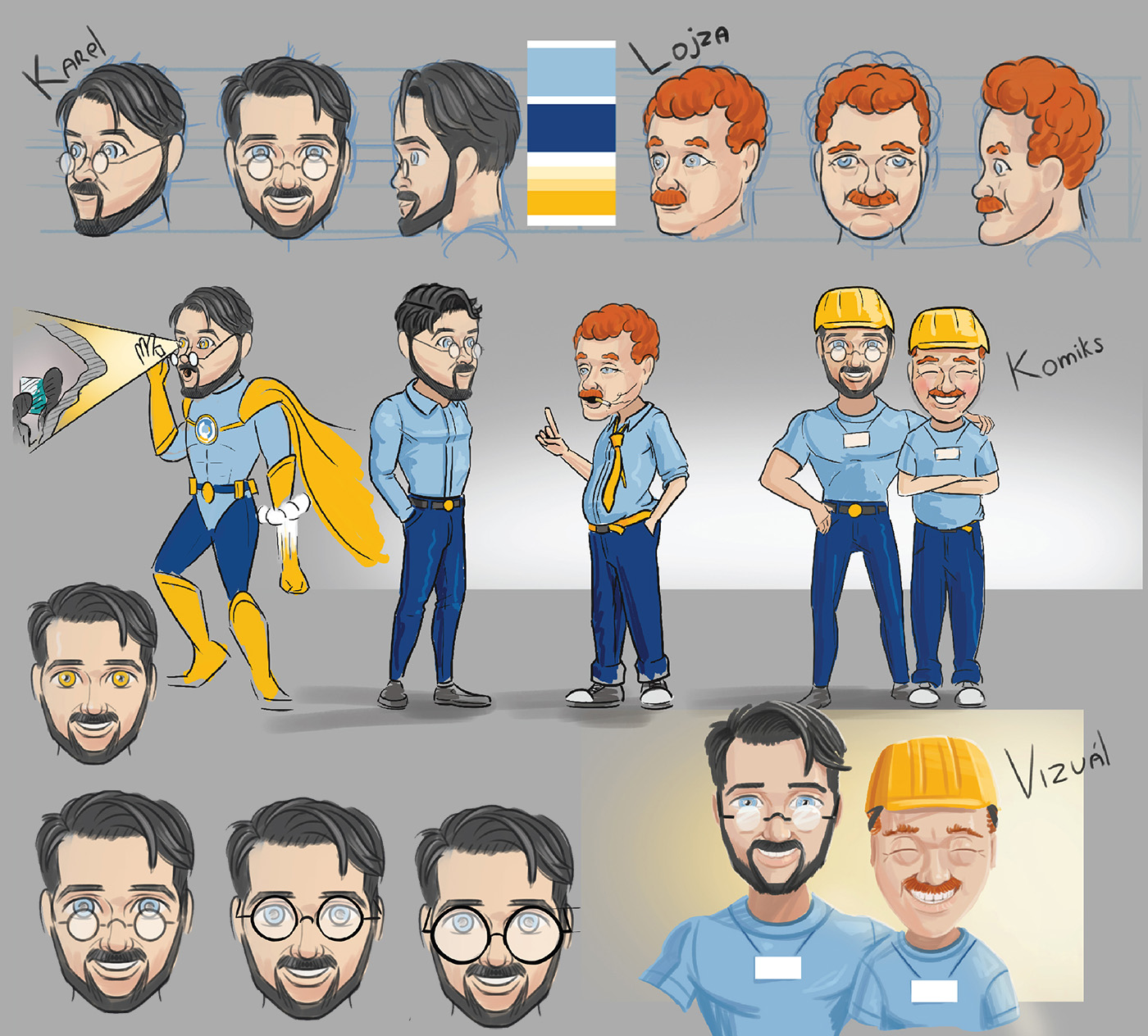 Komiksům předcházel ještě návrh hlavních postav, které jsou barevně sladěny s korporátními barvami. Každy komiks byl tištěn i použit na obrazovkách, pro tento účel byl vytvořen ve vrstvách připraven pro animaci.